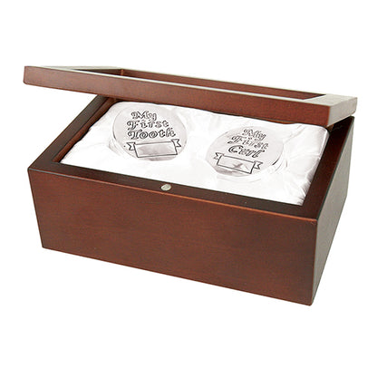 Rosewood Memory Set includes a Rosewood Finish Keepsake Box with 1 First Tooth Box and 1 First Curl Box.
