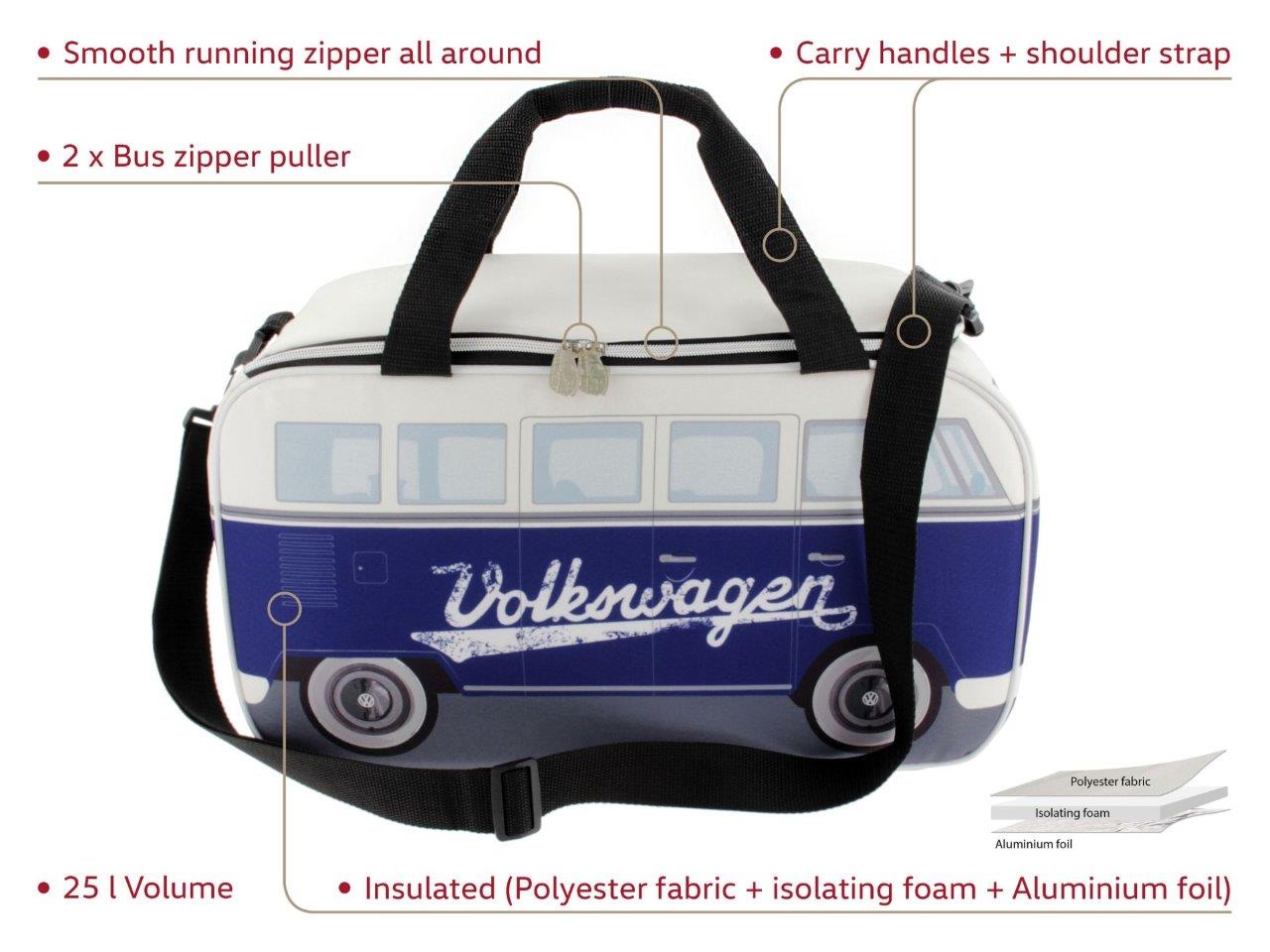 The lovingly designed VW T1 Bus/Campervan cooler bag is a real eye-catcher! It captures the hearts of fans of the iconic VW legend in a storm! Perfect for a relaxed day at the beach, camping trips, picnics, or festivals. It serves as a generous warming and cooling container with plenty of space for drinks and food. It makes the heart of every VW Campervan fan beat faster.