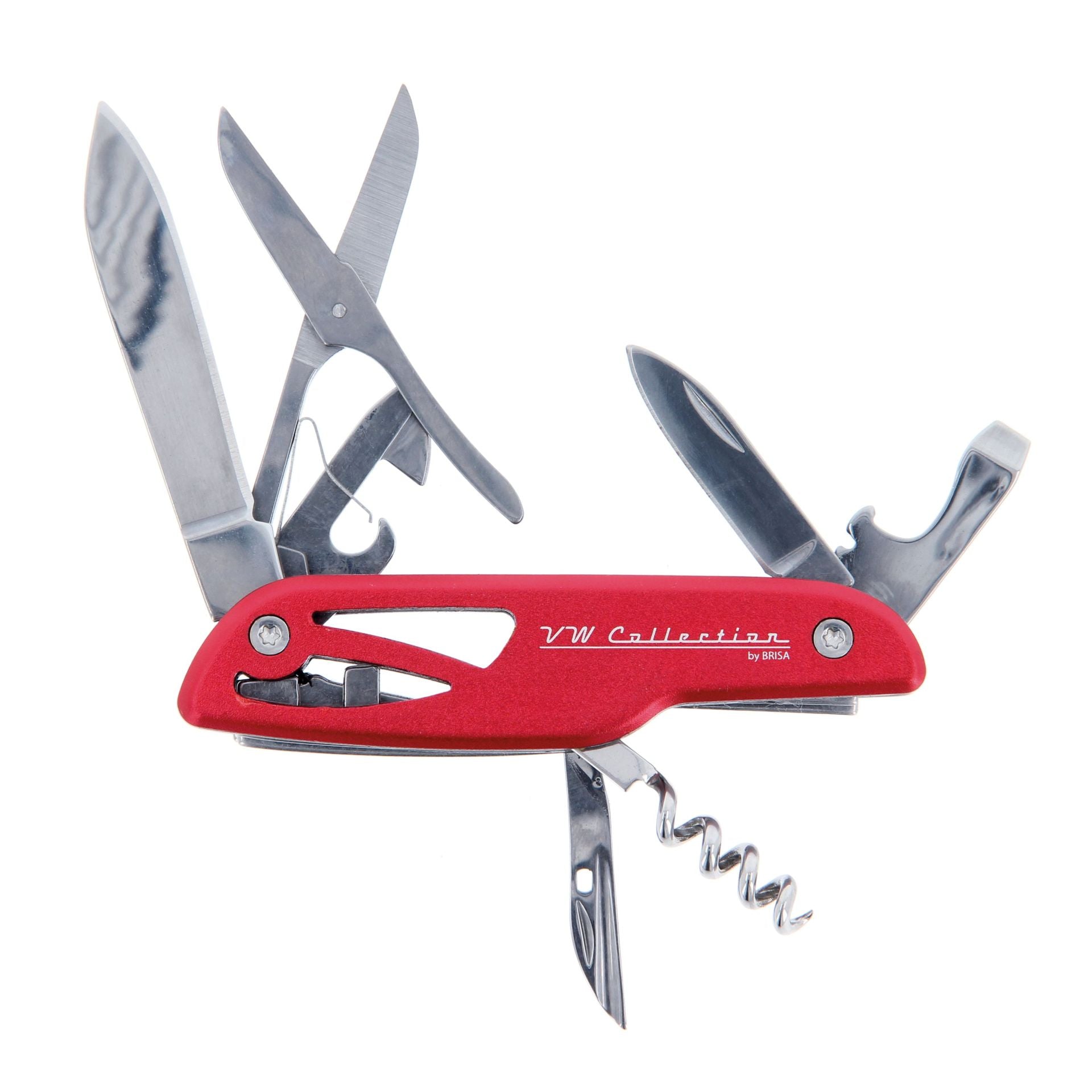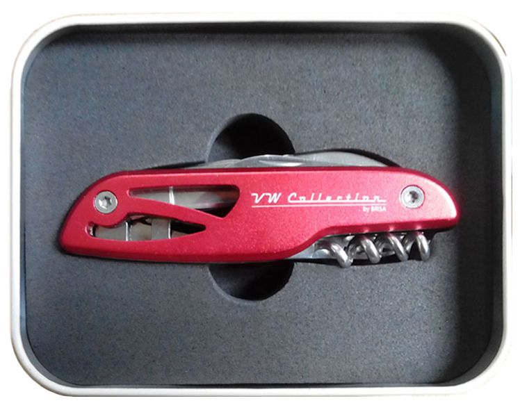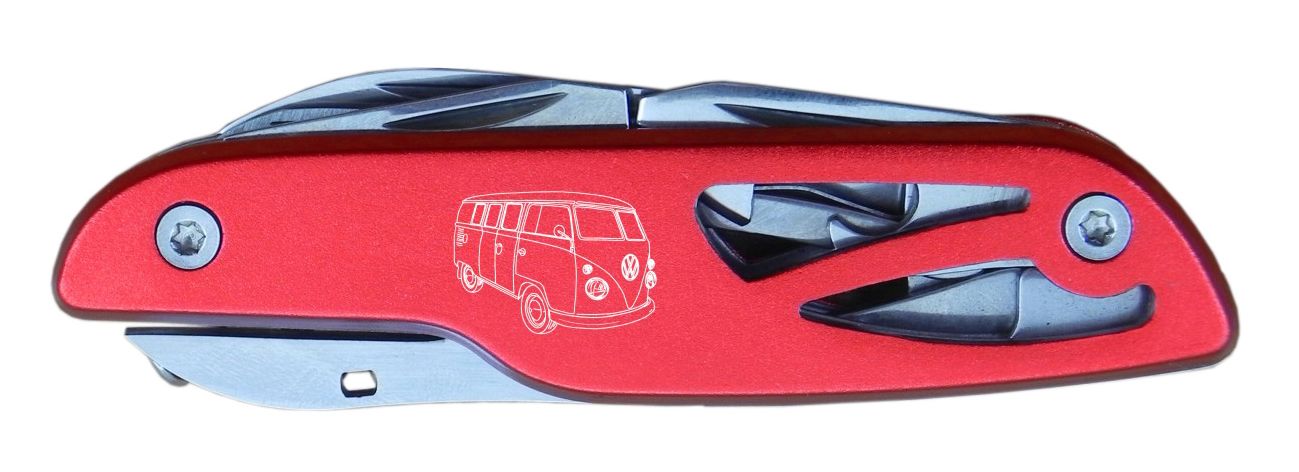 A practical pocket knife with a VW T1 Bus laser engraved on the side. Includes small & large knife blade, scissors, corkscrew, bottle opener, screwdriver and more.
