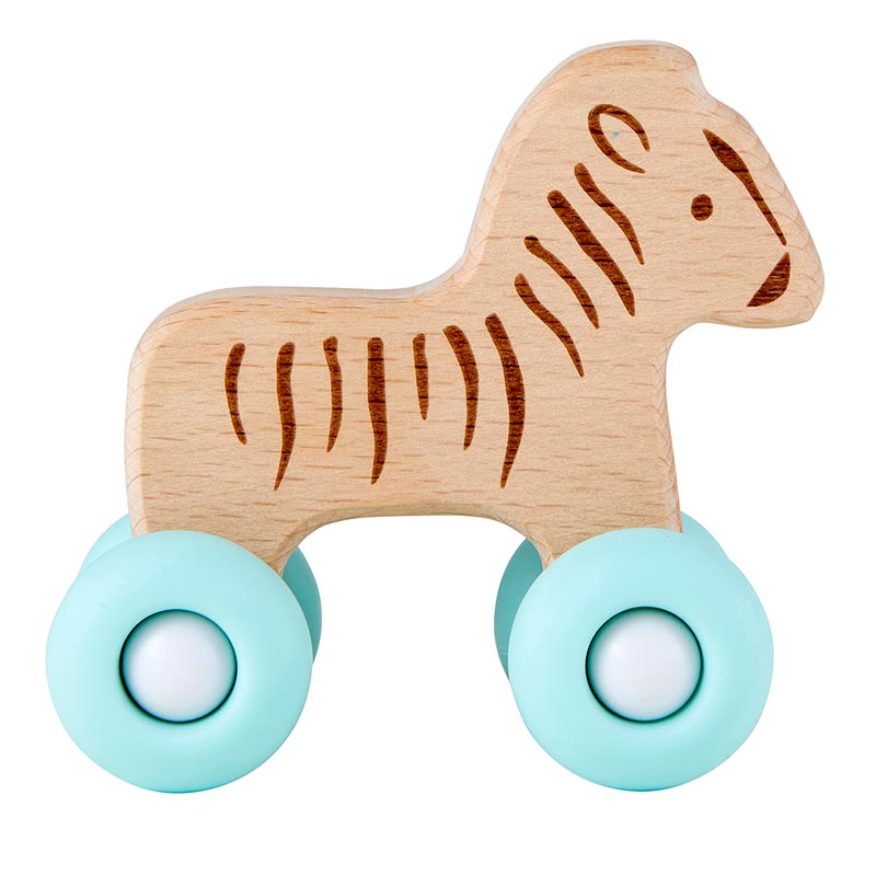 Natural wood zebra shaped toy includes soft silicone wheels to roll along with baby.